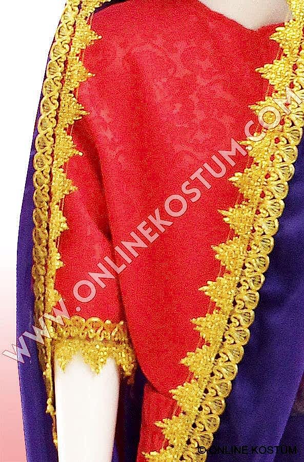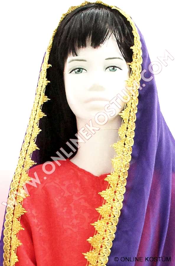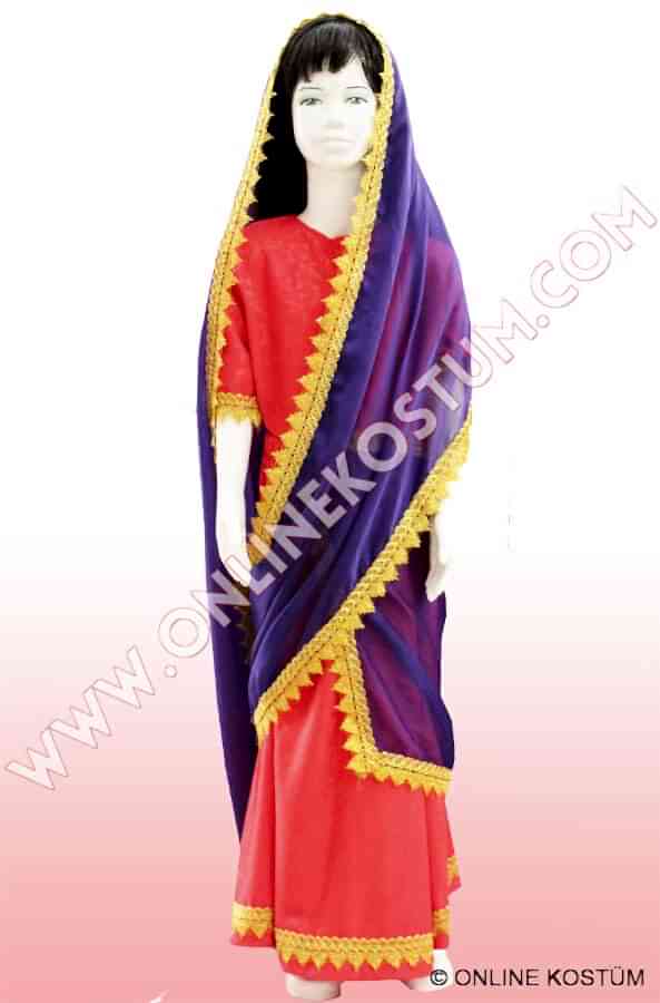 Hintli Kostümü, hint motifleri ile zenginleştirilmiş, mükemmel kalitede kumaştan imal edilmiştir. Hintli kostümü, üstte kısa kollu yelek, altta topuklara kadar uzanan etek, uçlarında çok güzel altın renkli bordürleri bulunmaktadır. Omuz ve başı saran ve uçlarında altın renkli güpür ile zenginleştirilmiş hint şalı bulunmaktadır.